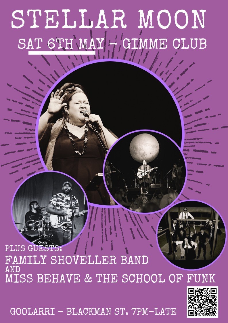 Stellar Moon are putting on a show at Goolarri, with full the band and special guests Family Shoveller Band, ending the night with a set from Miss Behave and the School of Funk! We’re EXCITED!!!!